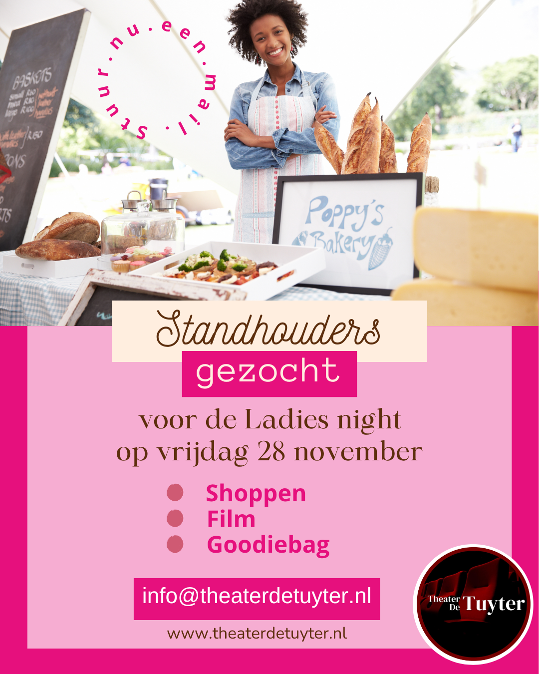 Theater De Tuyter organiseert op vrijdagavond 28 november 2025 een gezellige Ladies Night en wij zijn op zoek naar enthousiaste standhouders om deze avond onvergetelijk te maken! Ben jij een ondernemer met een passie voor mode, beauty, wellness of lifestyle? Dan is dit jouw kans om je producten en diensten te presenteren aan een breed publiek van enthousiaste dames.